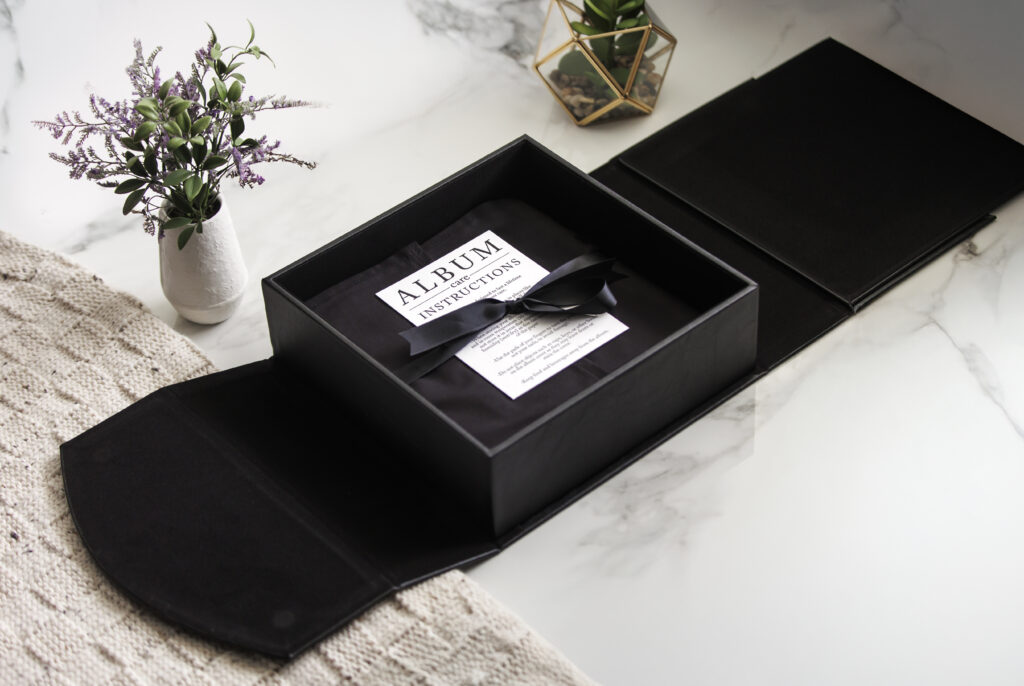 Let us know if you’d like to swap out the standard leather presentation box for a custom walnut wooden keepsake box to store your album! *$350