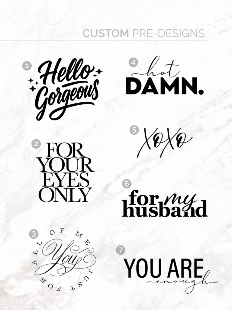 You can choose from the two STANDARD FONTS above in Step 4^ and pick your phrase for the cover. Some examples: