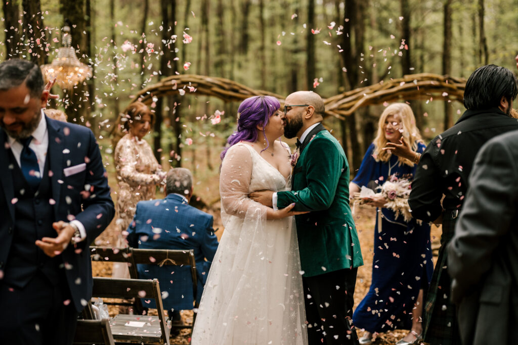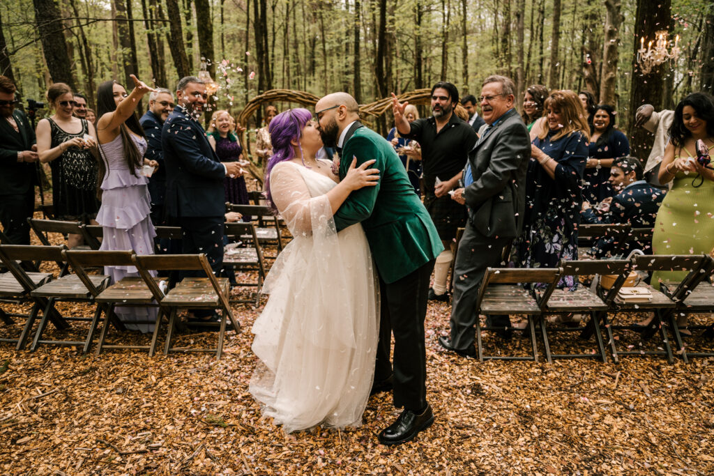 The rain shower cleared right before the ceremony, and Katie and Jorge shared their first kiss amongst the trees. With a confetti toss send off down the aisle, these two were officially married and ready to party the night away to Patrick’s mixes (Non-Traditional Wedding DJs)! Guests dined and danced all night; you could truly feel the love and happiness from everyone in attendance.