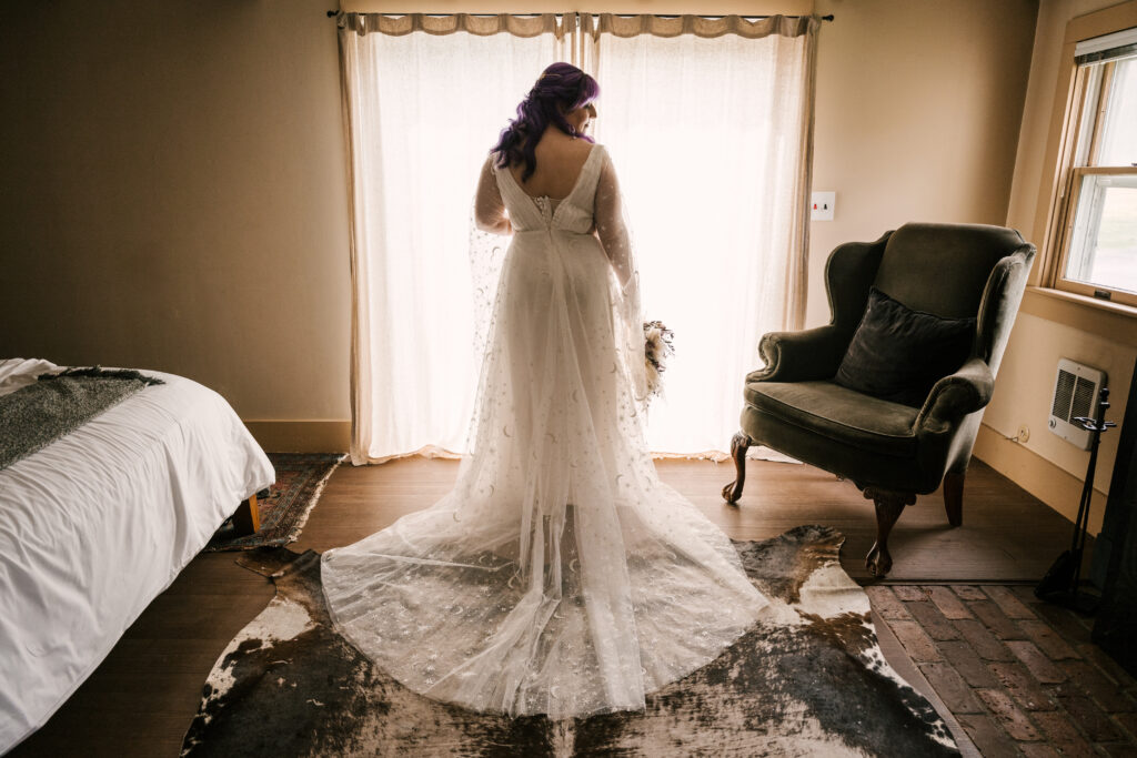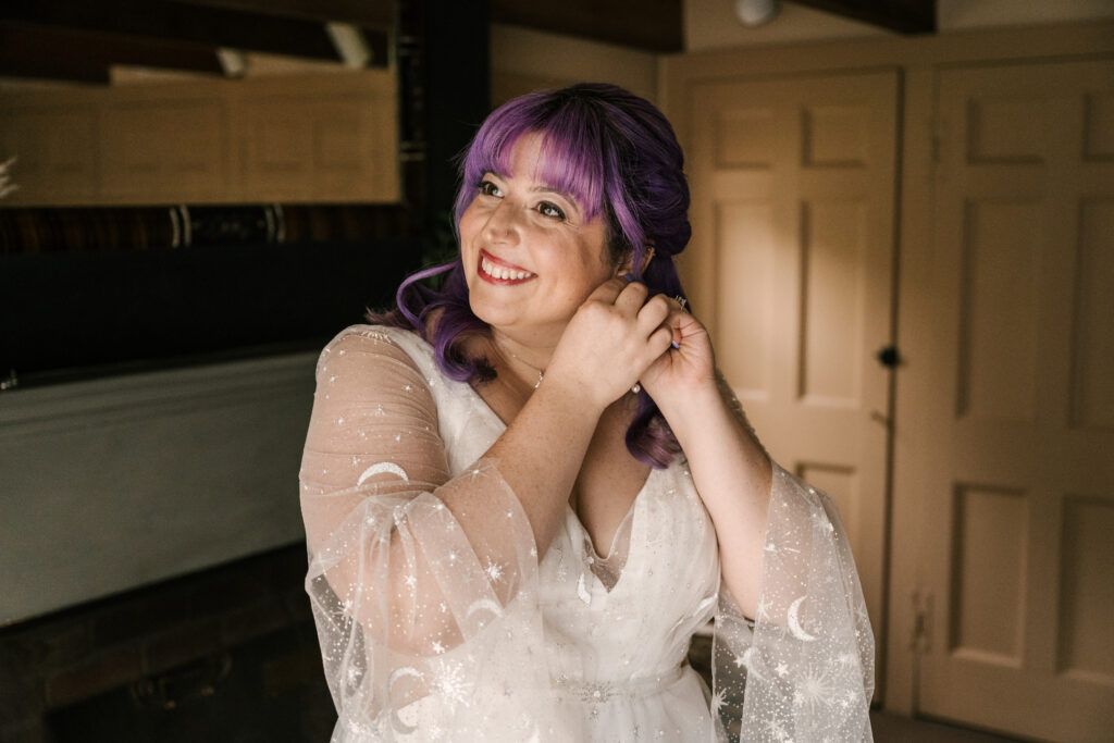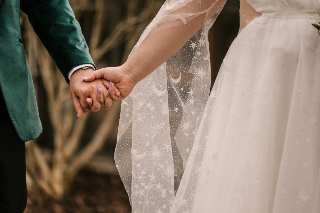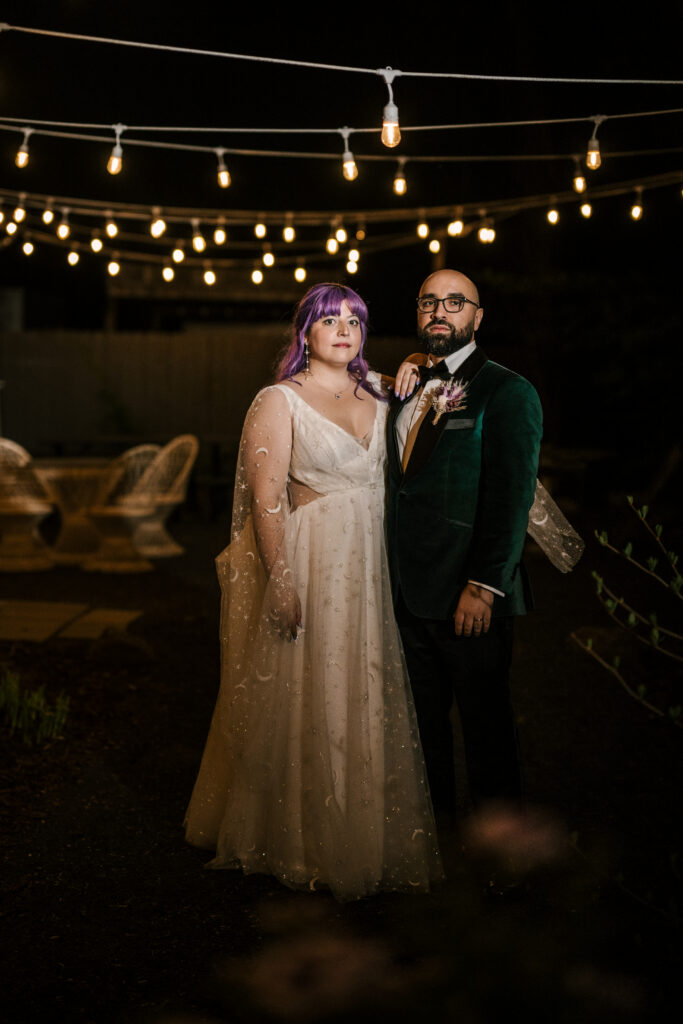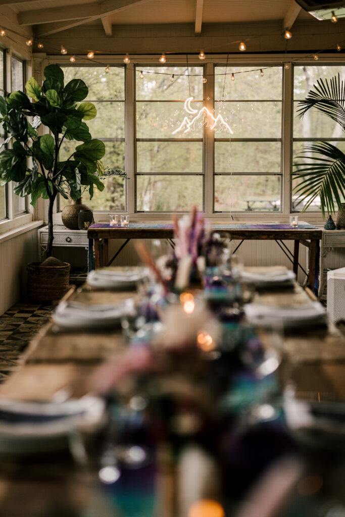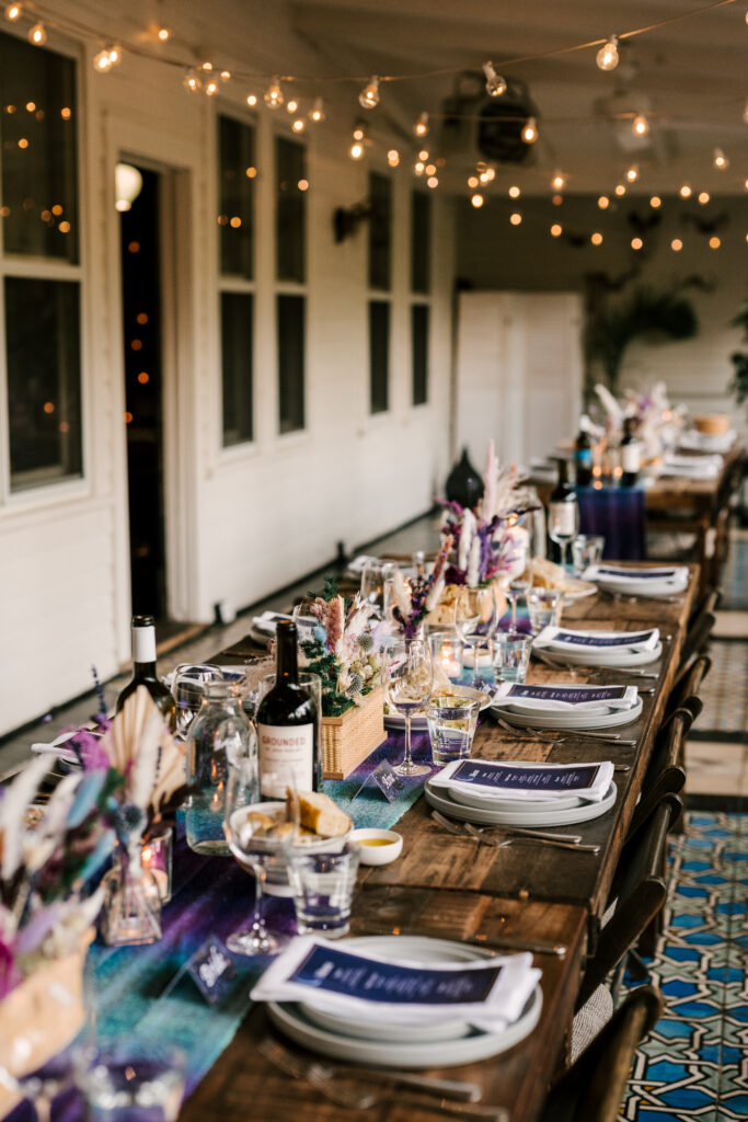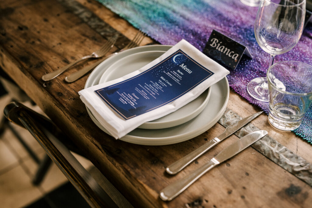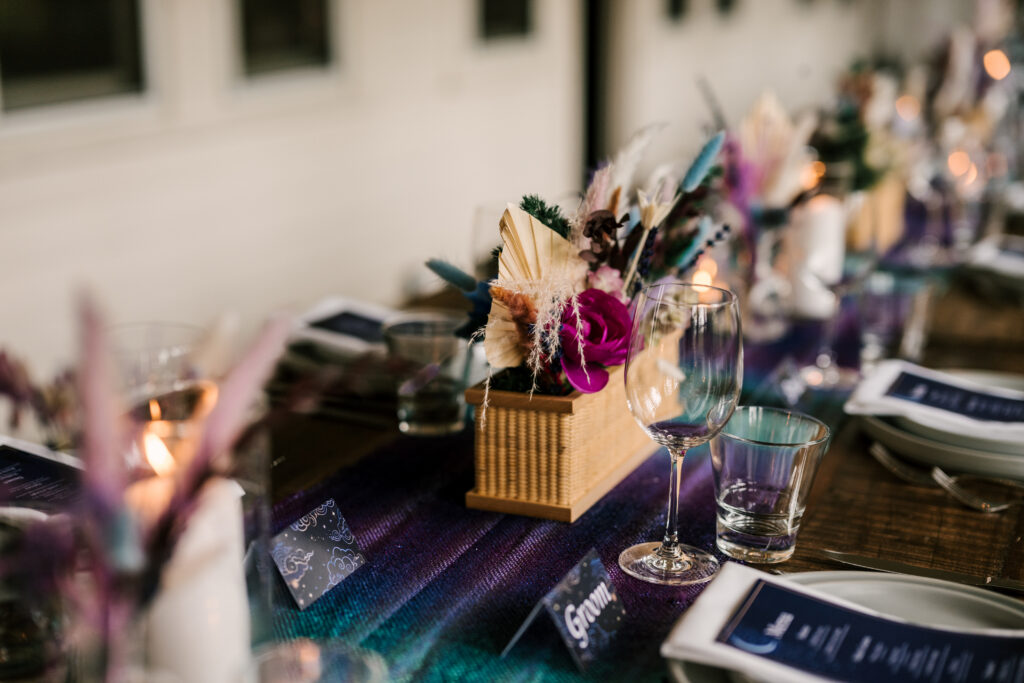 Katie looked absolutely gorgeous in her gown from Flora and Lane – the allover moon and star embroidery tied seamlessly into their celestial theme. The reception space was brought to life with tablescapes of dark blues, greens, purples and creams; colors evocative of the Northern Lights! Fun fact: Katie even wove the table runners herself!