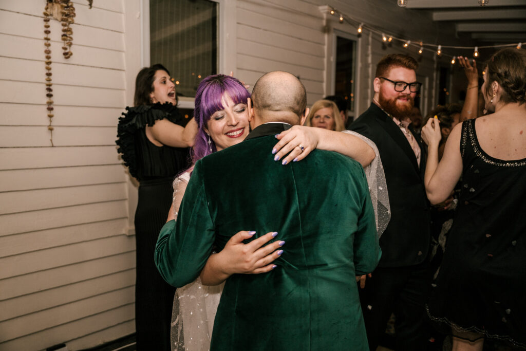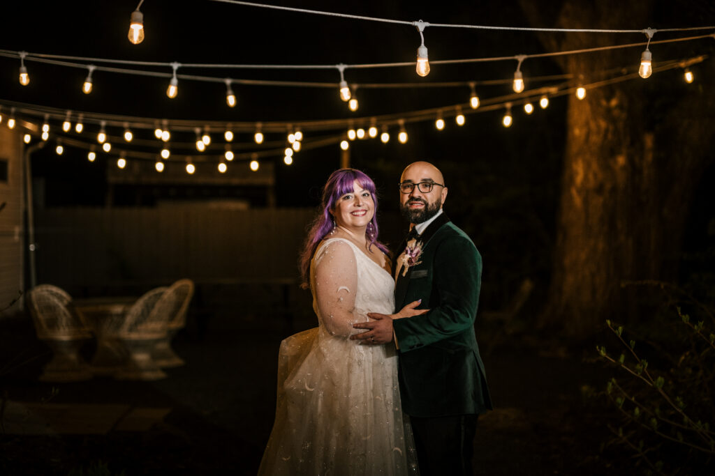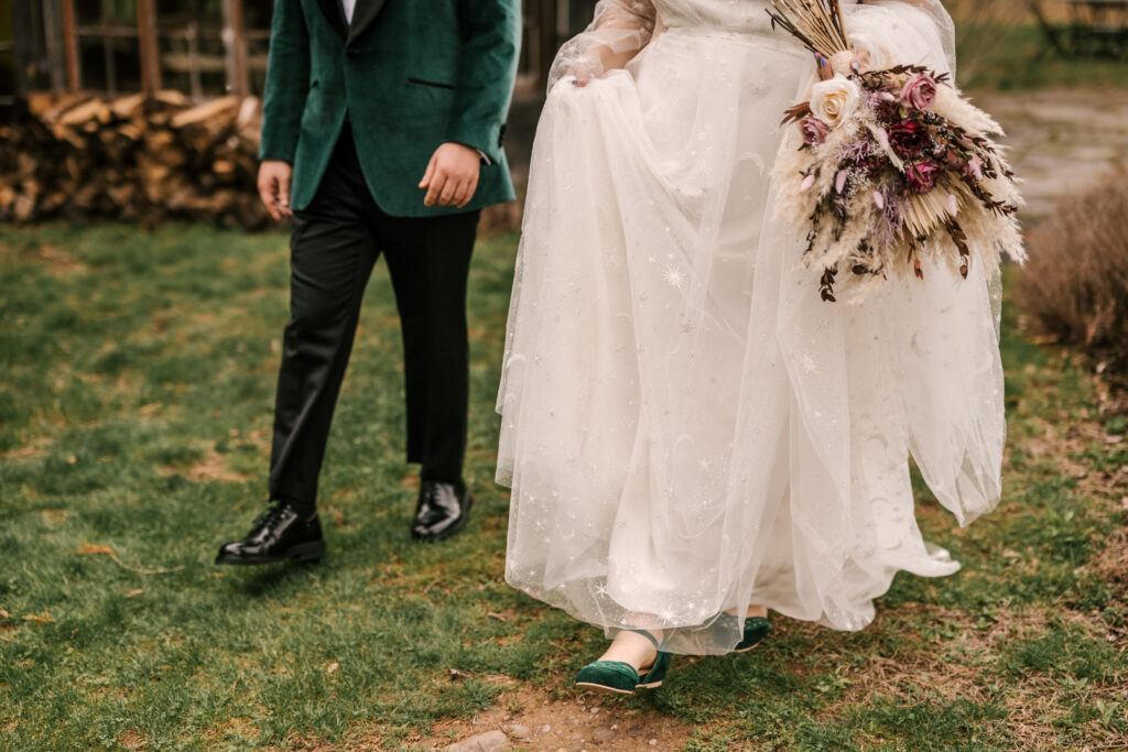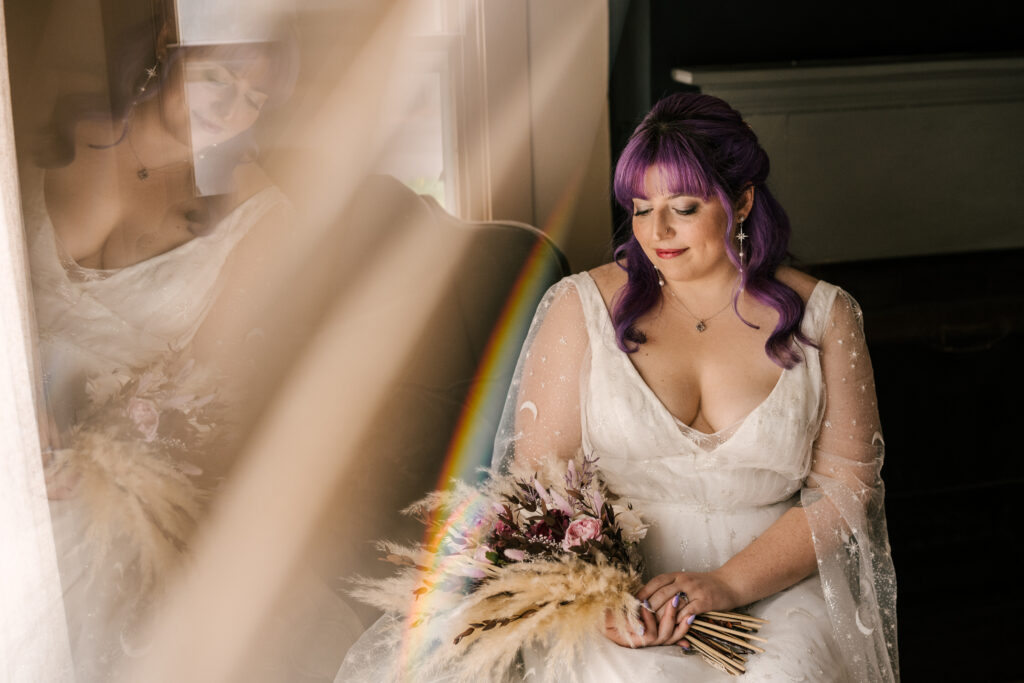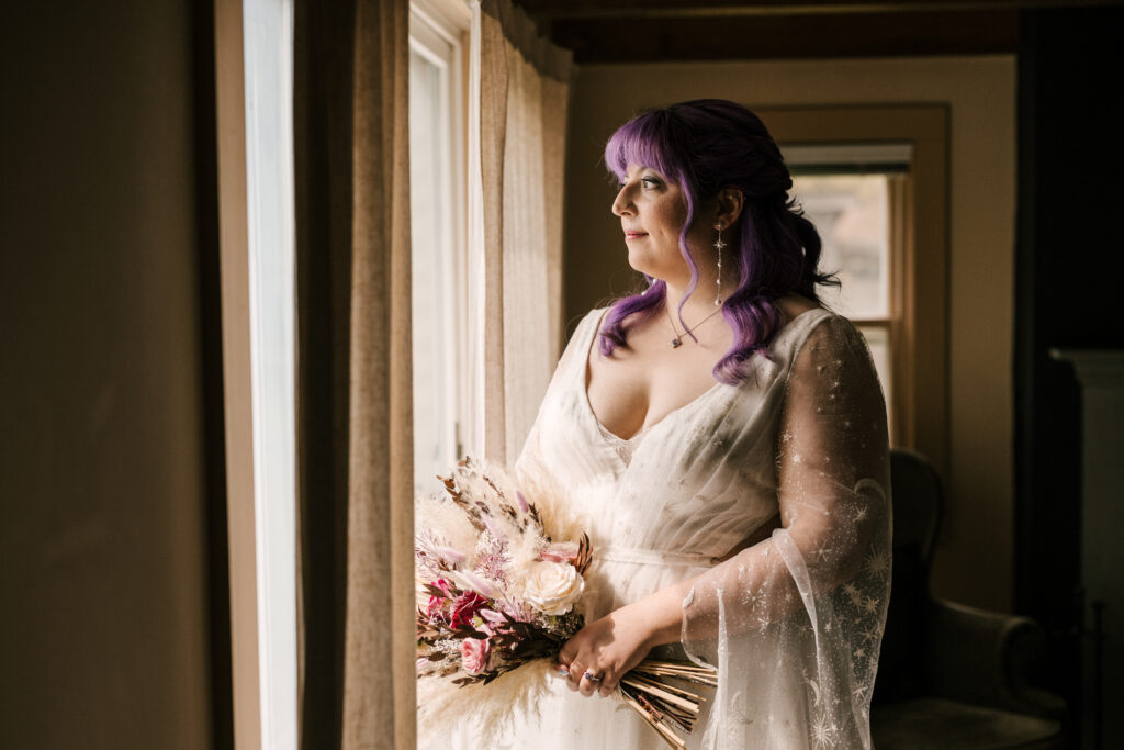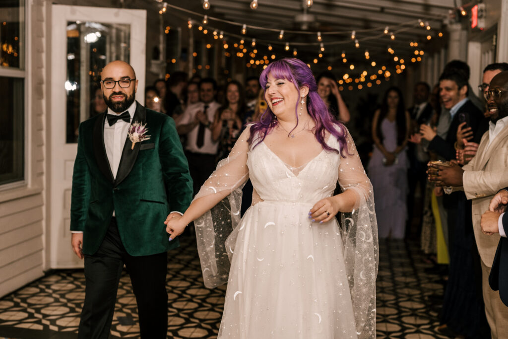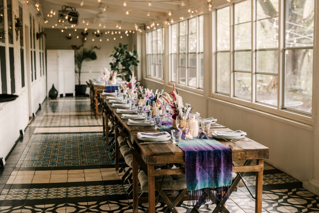 Katie looked absolutely gorgeous in her gown from Flora and Lane – the allover moon and star embroidery tied seamlessly into their celestial theme. The reception space was brought to life with tablescapes of dark blues, greens, purples and creams; colors evocative of the Northern Lights! Fun fact: Katie even wove the table runners herself!