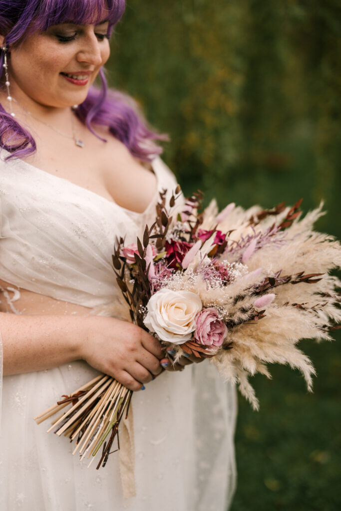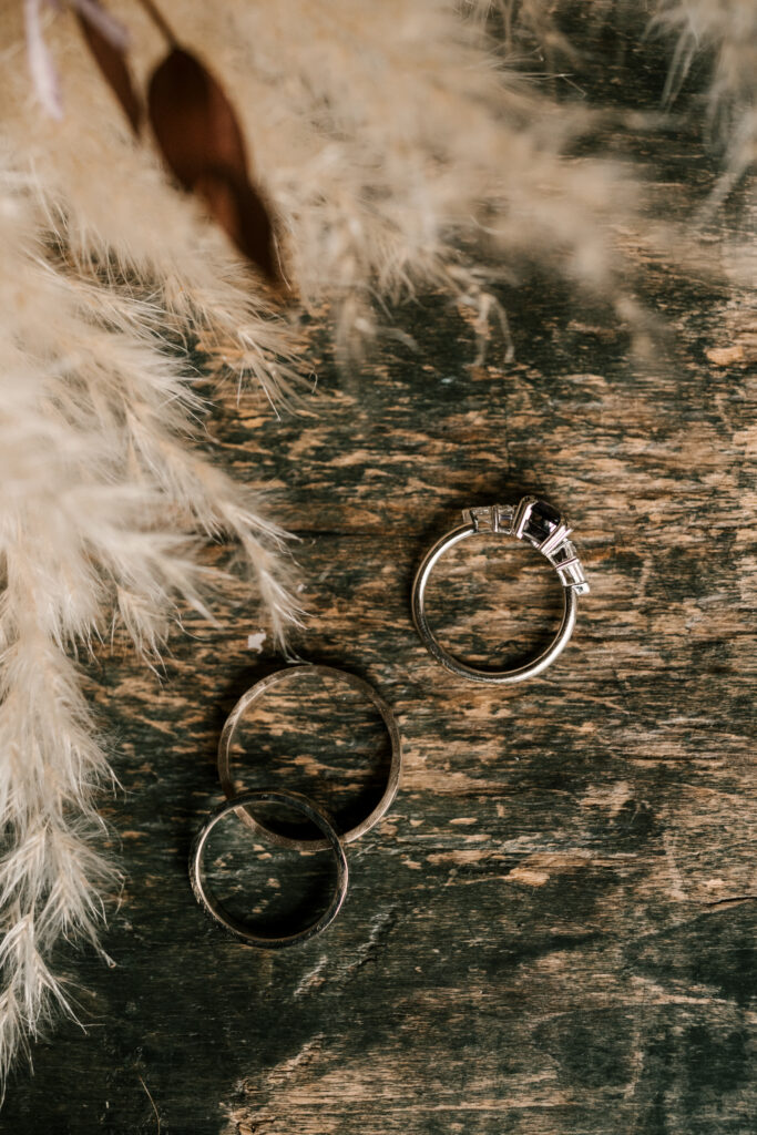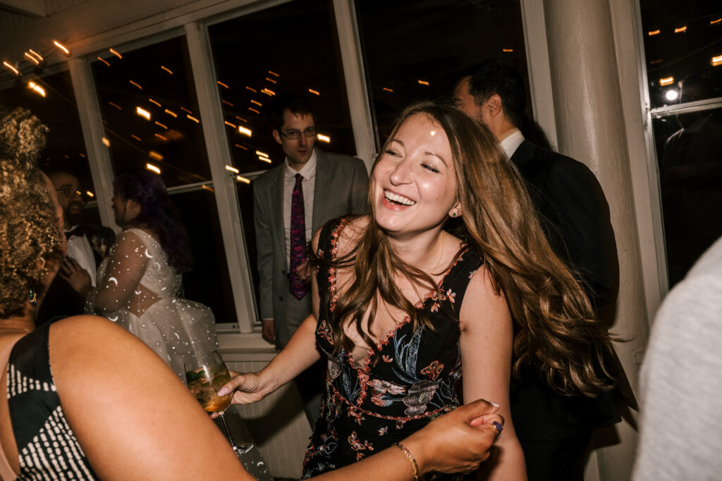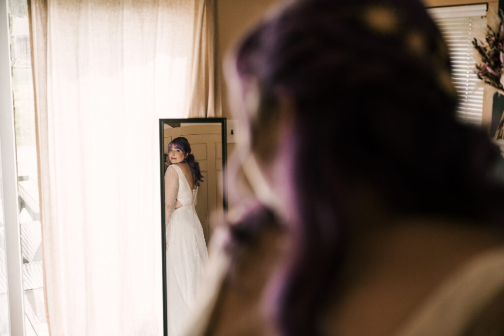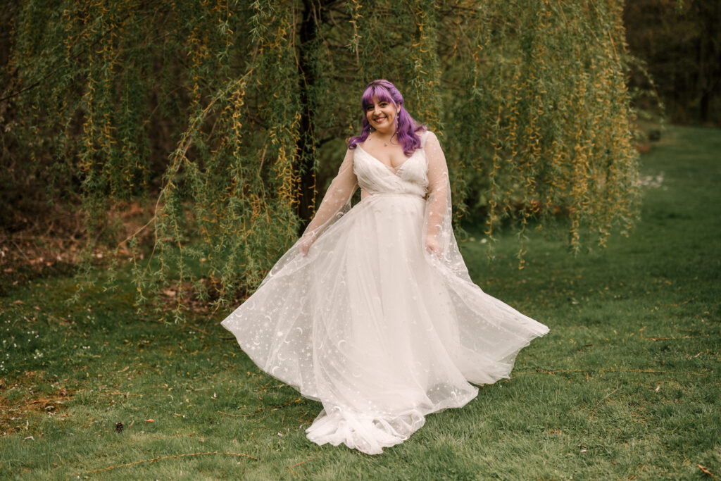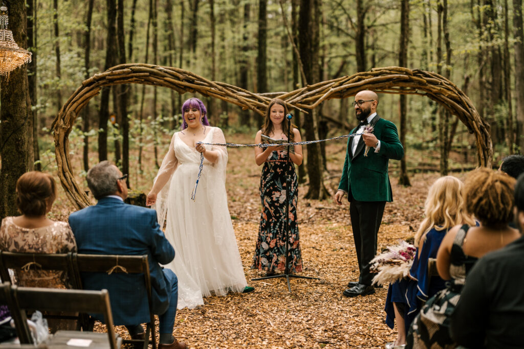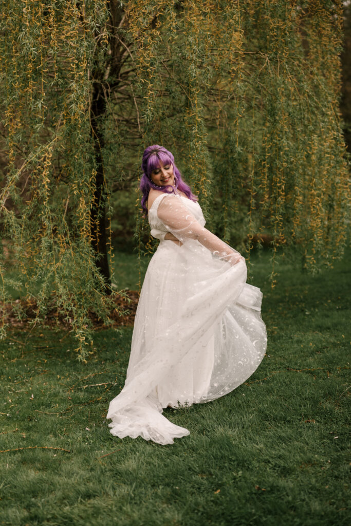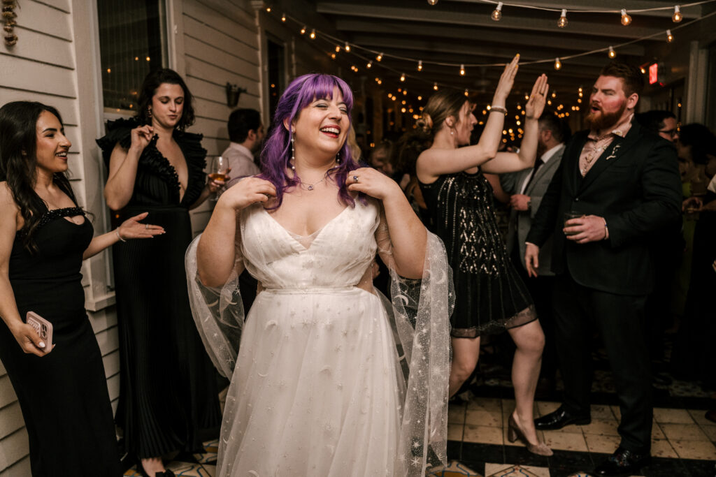 Katie looked absolutely gorgeous in her gown from Flora and Lane – the allover moon and star embroidery tied seamlessly into their celestial theme. The reception space was brought to life with tablescapes of dark blues, greens, purples and creams; colors evocative of the Northern Lights! Fun fact: Katie even wove the table runners herself!
