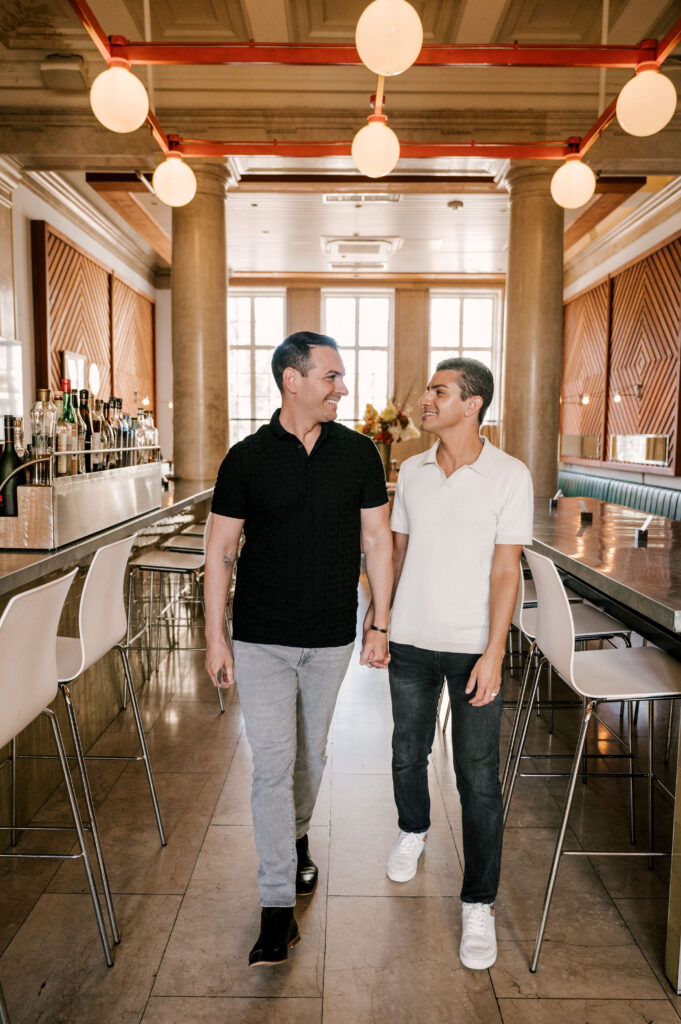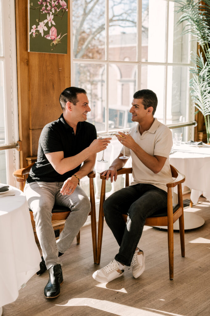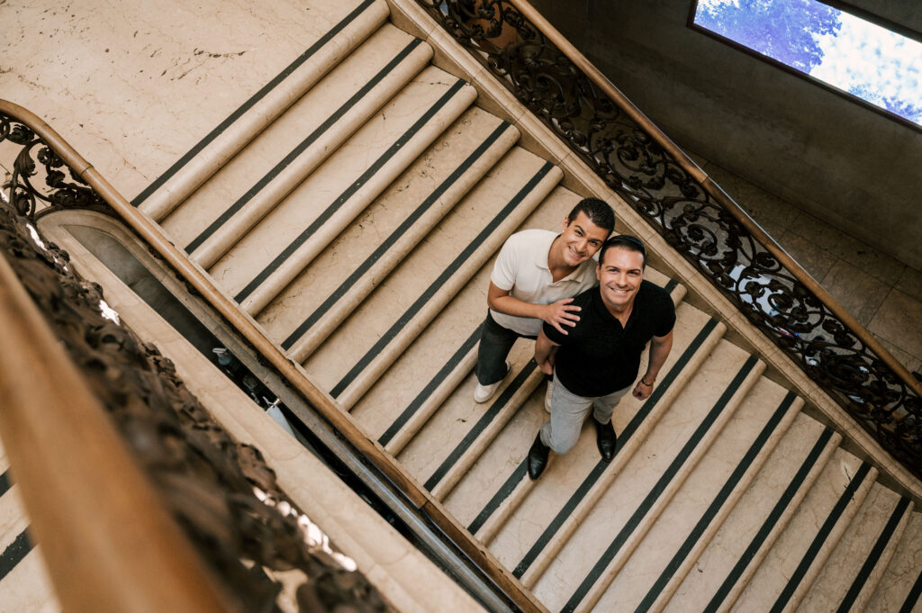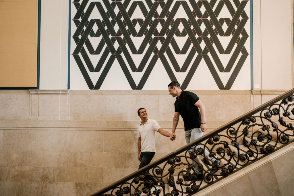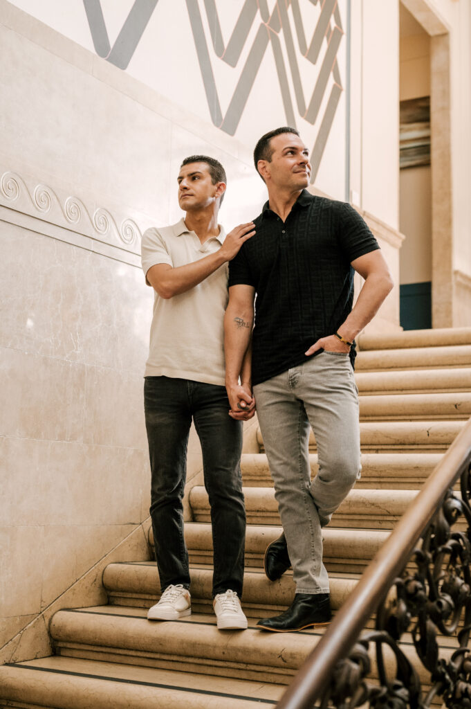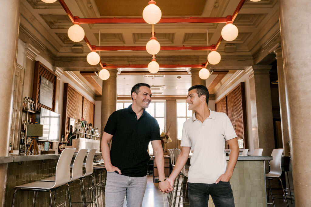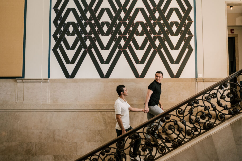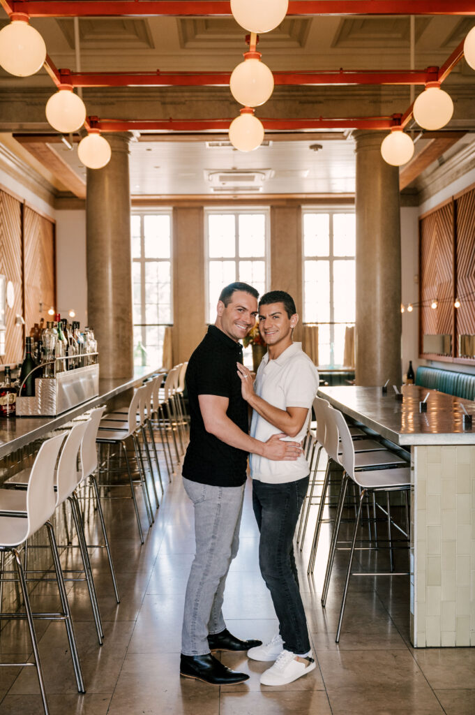 After crafting the perfect cocktail, Shawn & Anthony wandered through the various rooms in the historic building. The marble staircase felt regal and timeless, while the red couch and old-school posters of another area brought a vintage-aesthetic, making for an incredible variety of backdrops. Inside one of the iconic dining rooms, soaring palladian windows flooded the space with natural light.