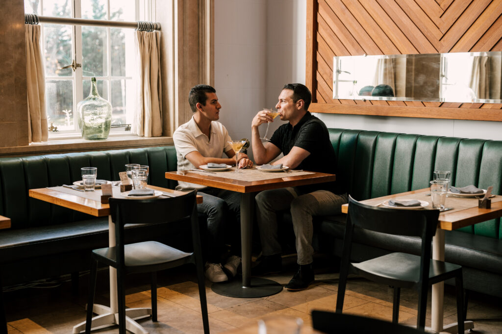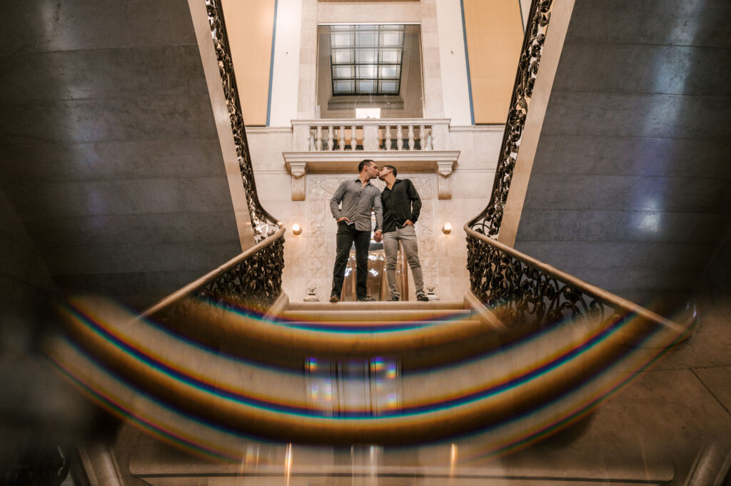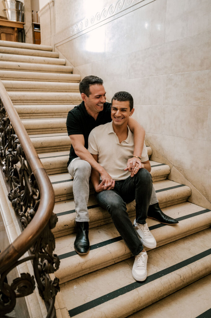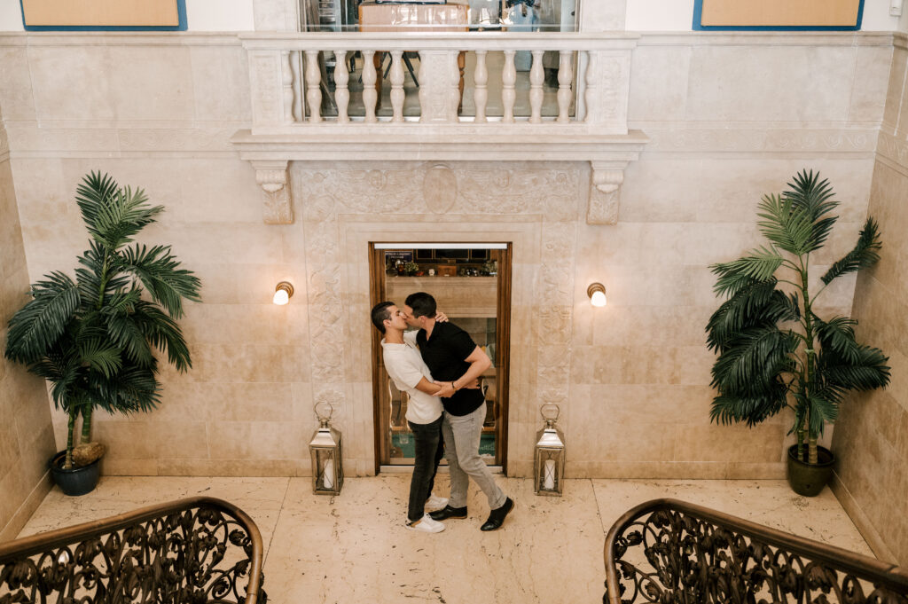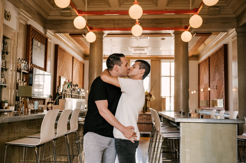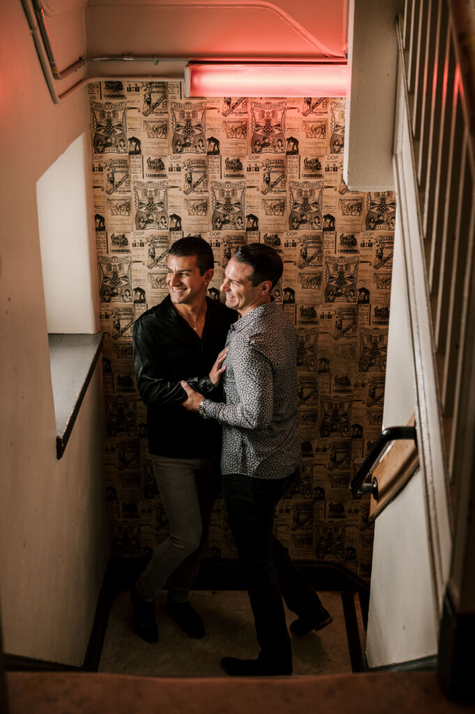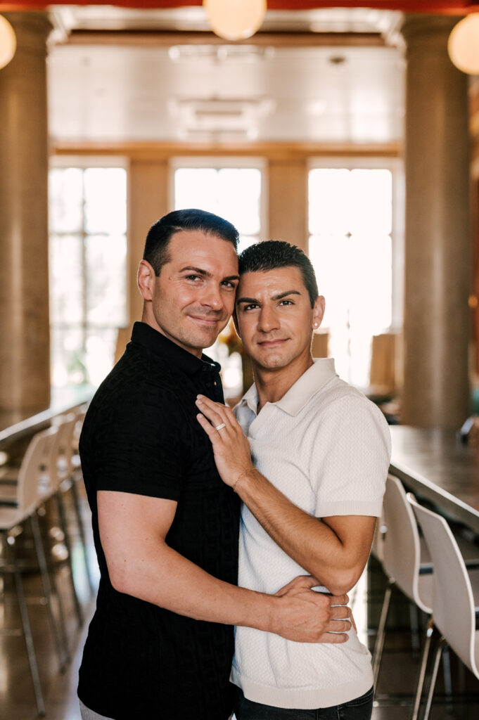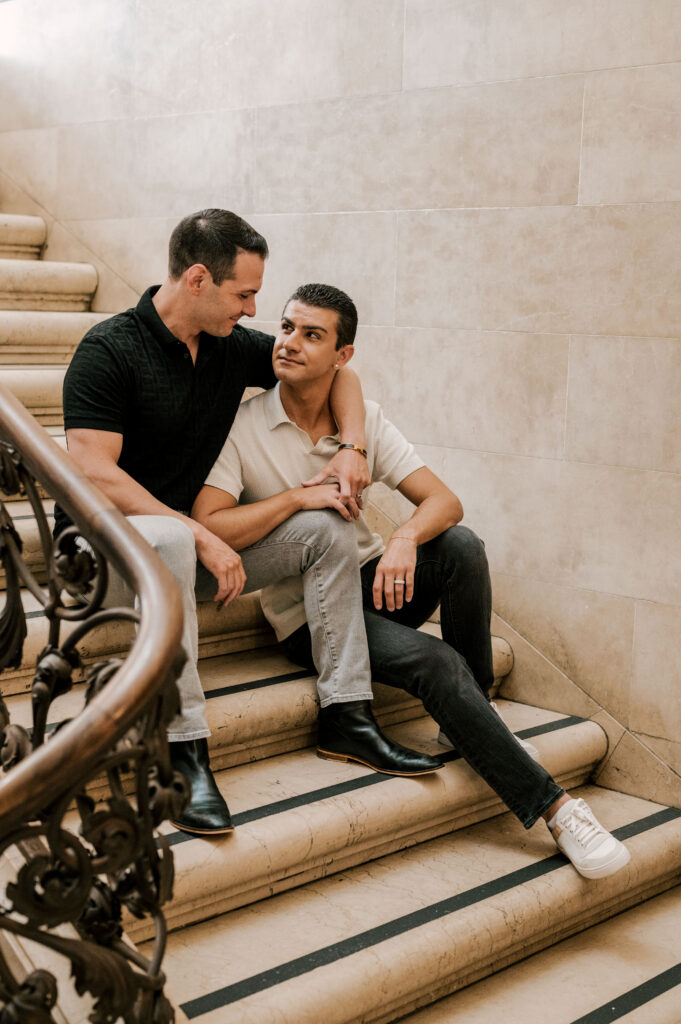 After crafting the perfect cocktail, Shawn & Anthony wandered through the various rooms in the historic building. The marble staircase felt regal and timeless, while the red couch and old-school posters of another area brought a vintage-aesthetic, making for an incredible variety of backdrops. Inside one of the iconic dining rooms, soaring palladian windows flooded the space with natural light.