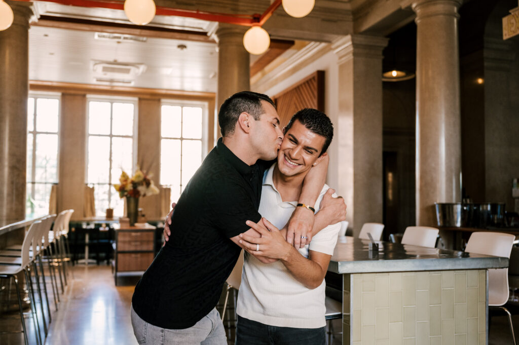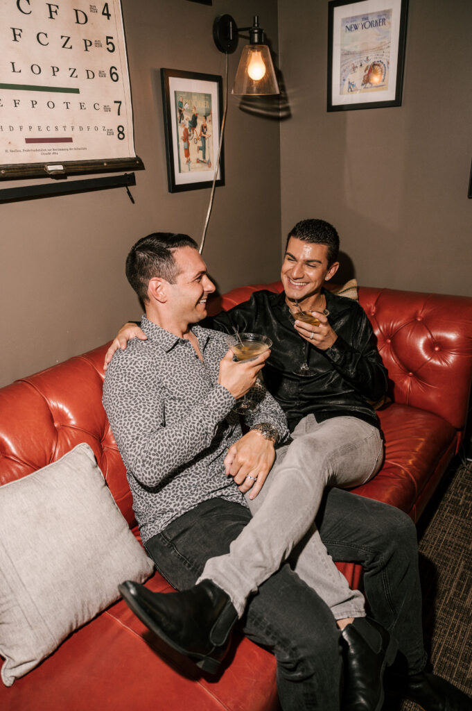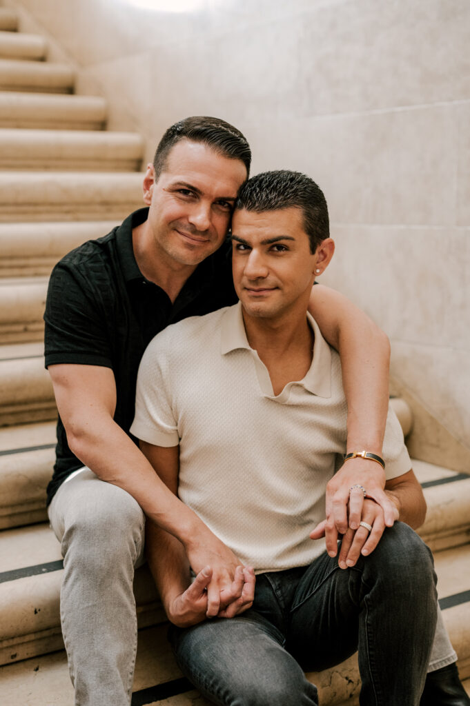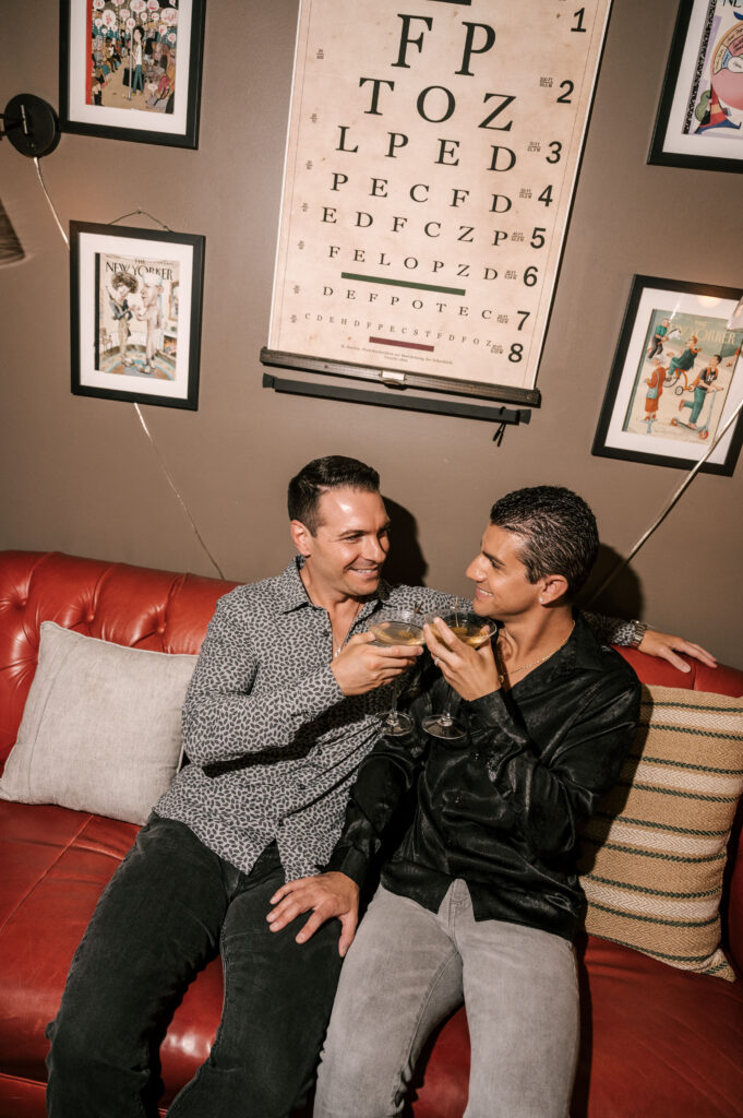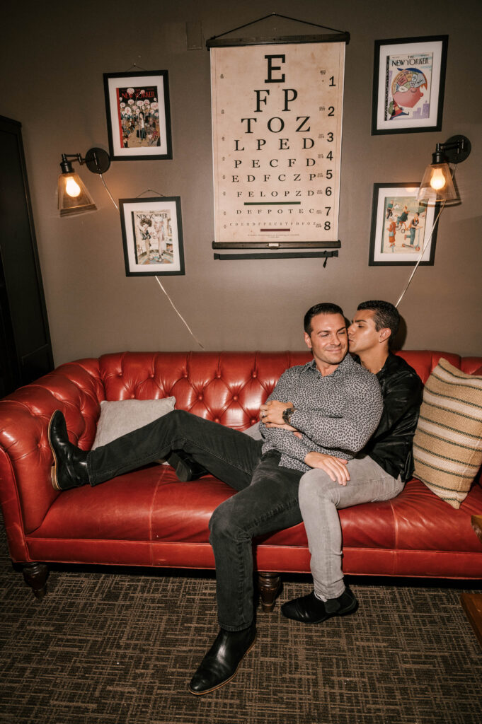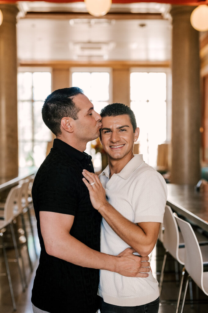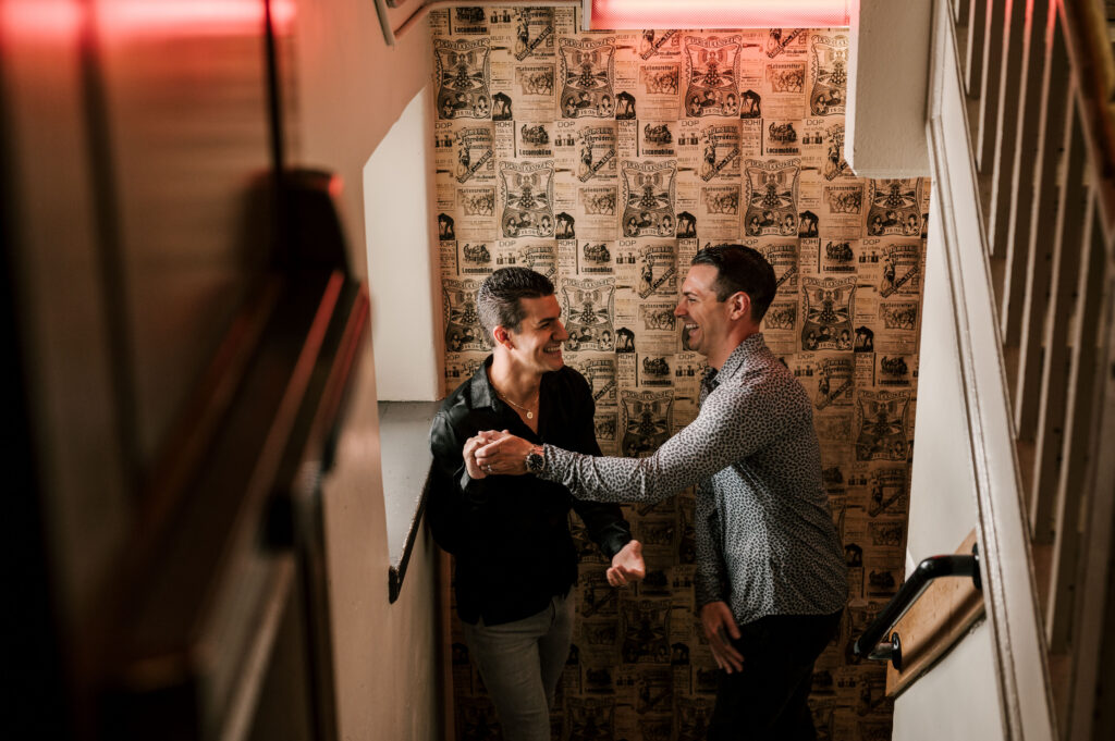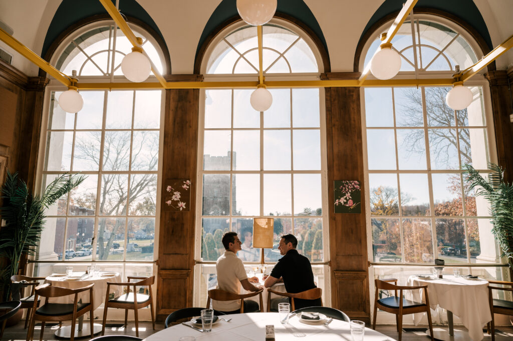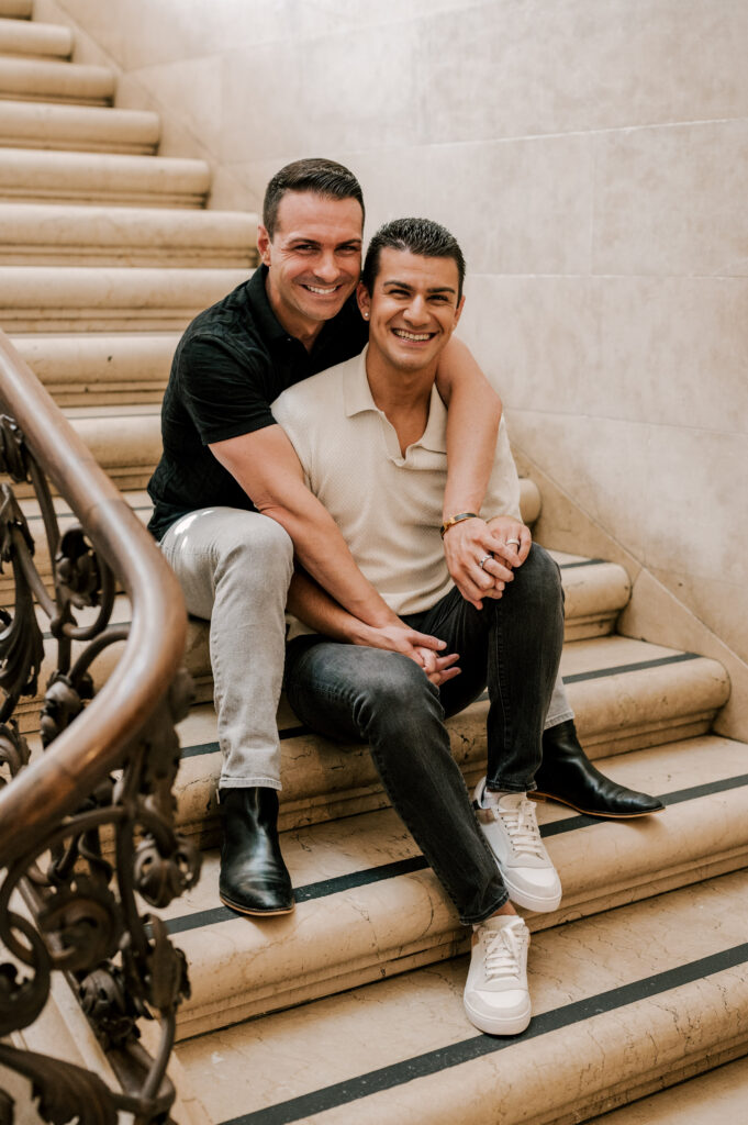 After crafting the perfect cocktail, Shawn & Anthony wandered through the various rooms in the historic building. The marble staircase felt regal and timeless, while the red couch and old-school posters of another area brought a vintage-aesthetic, making for an incredible variety of backdrops. Inside one of the iconic dining rooms, soaring palladian windows flooded the space with natural light.