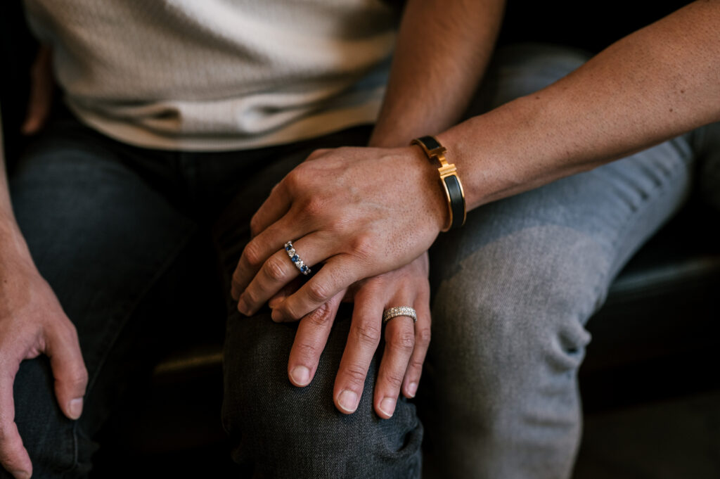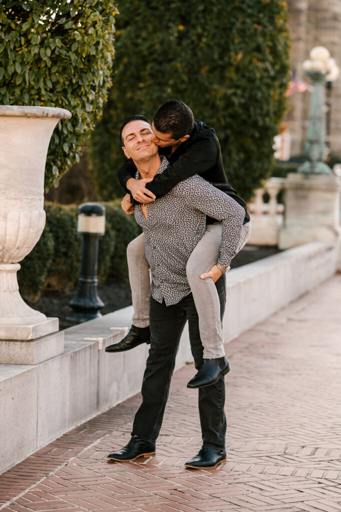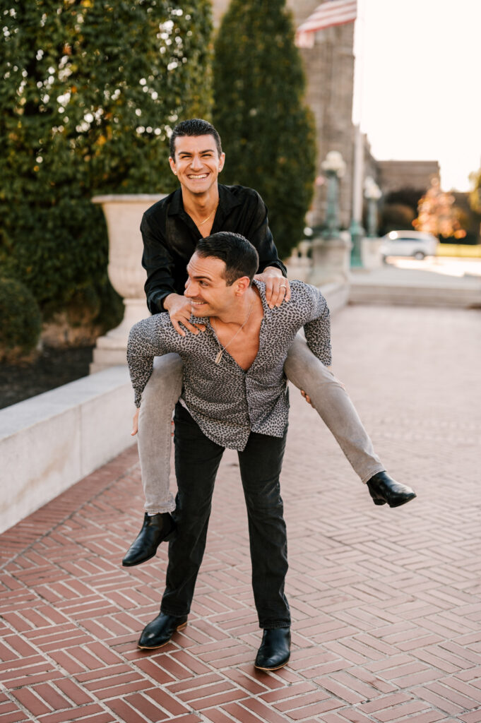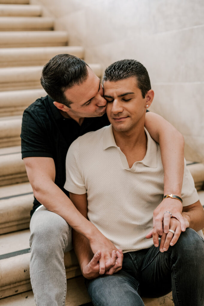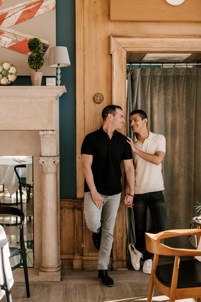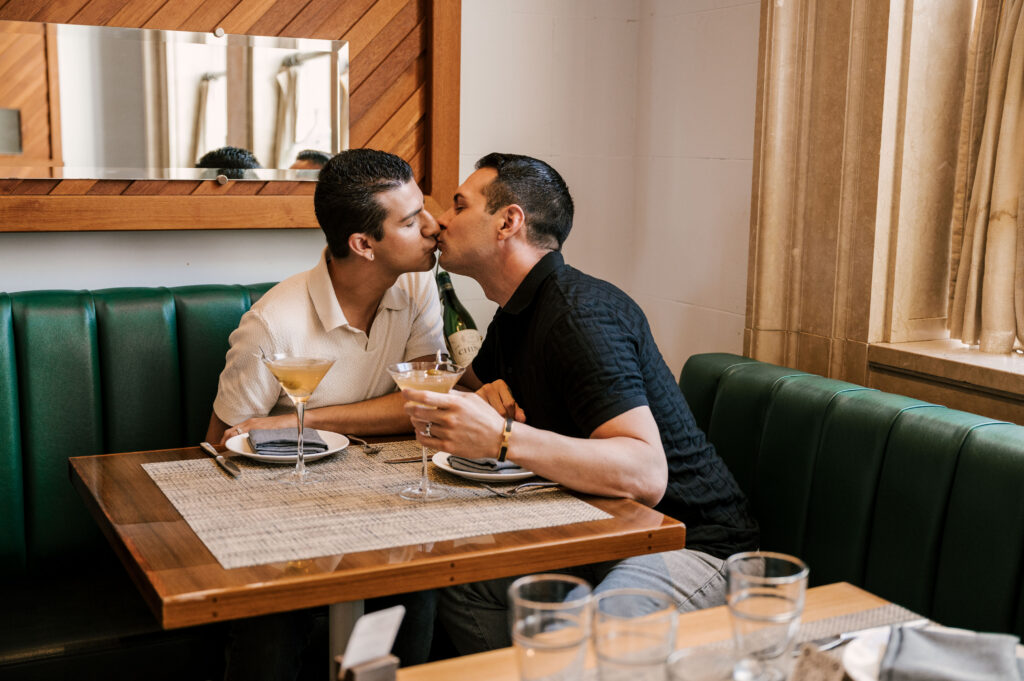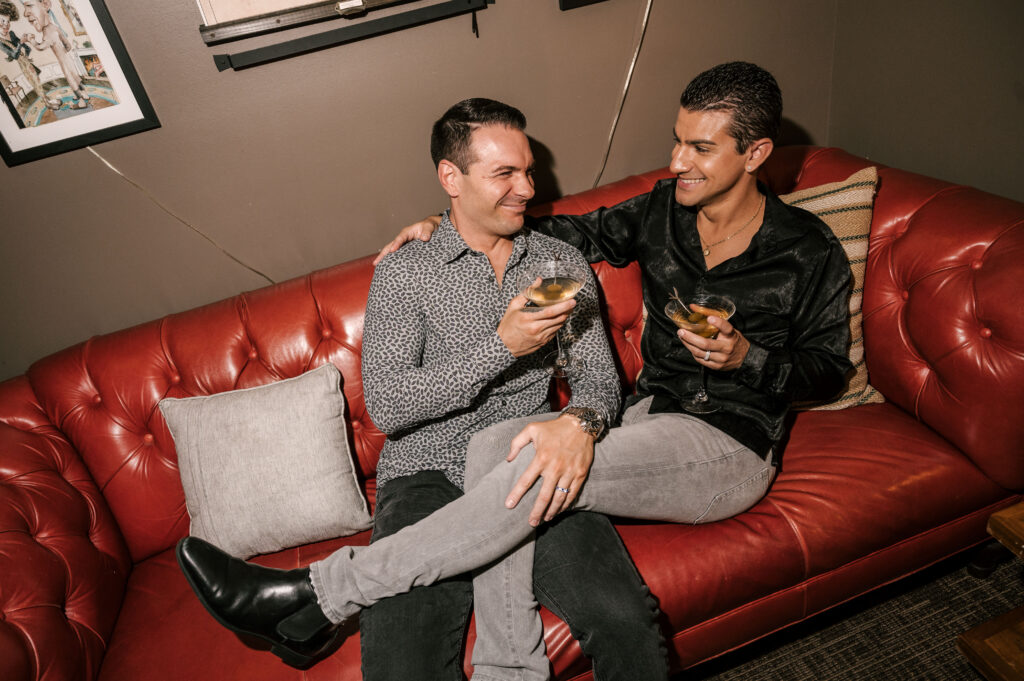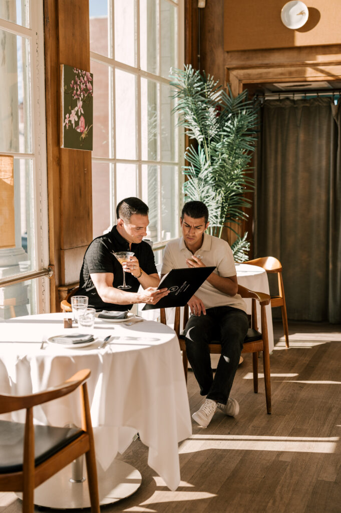 After crafting the perfect cocktail, Shawn & Anthony wandered through the various rooms in the historic building. The marble staircase felt regal and timeless, while the red couch and old-school posters of another area brought a vintage-aesthetic, making for an incredible variety of backdrops. Inside one of the iconic dining rooms, soaring palladian windows flooded the space with natural light.