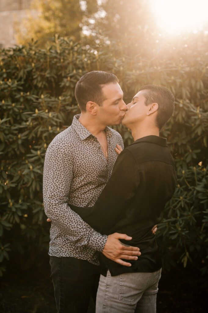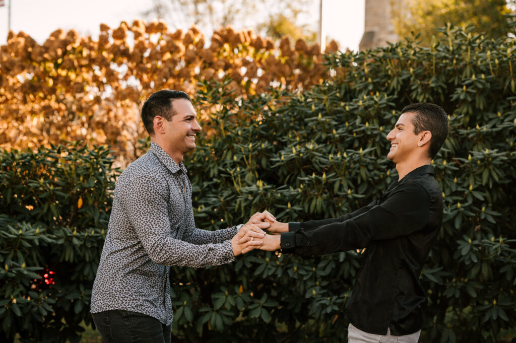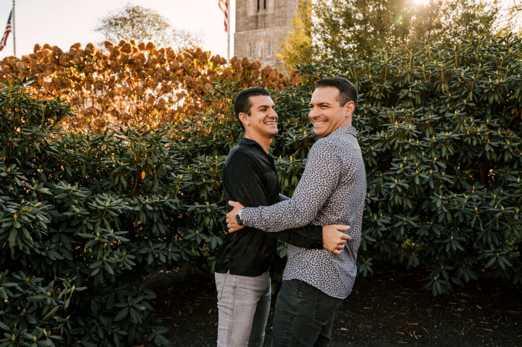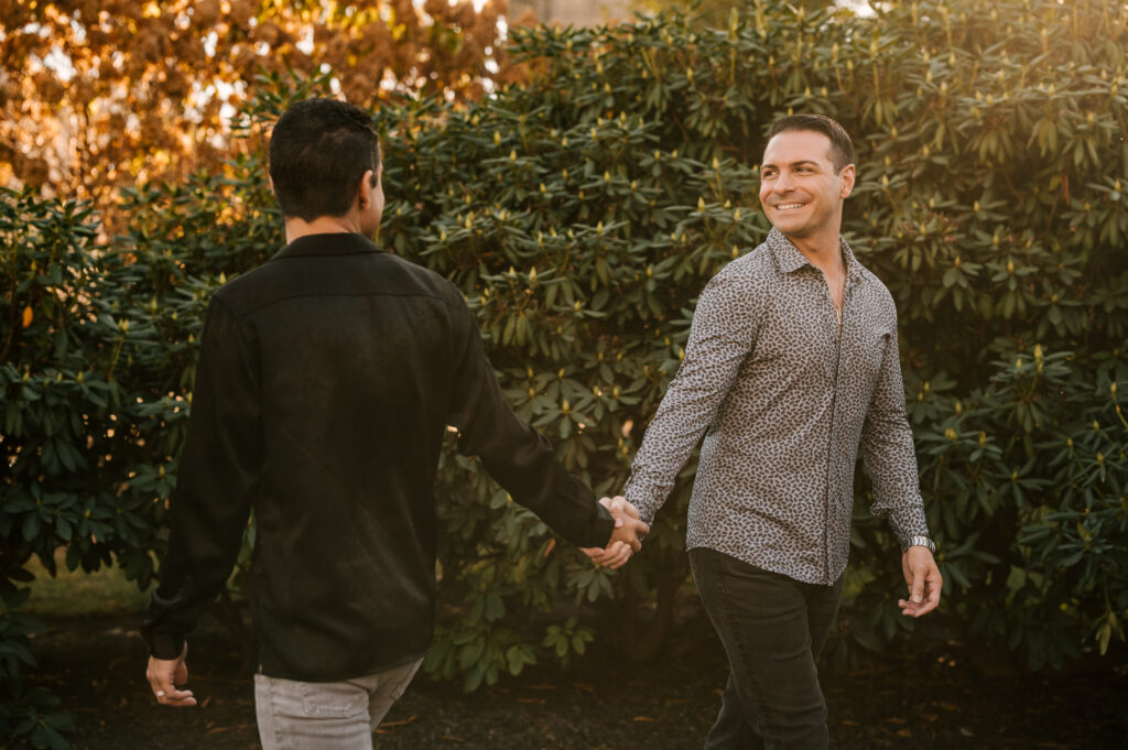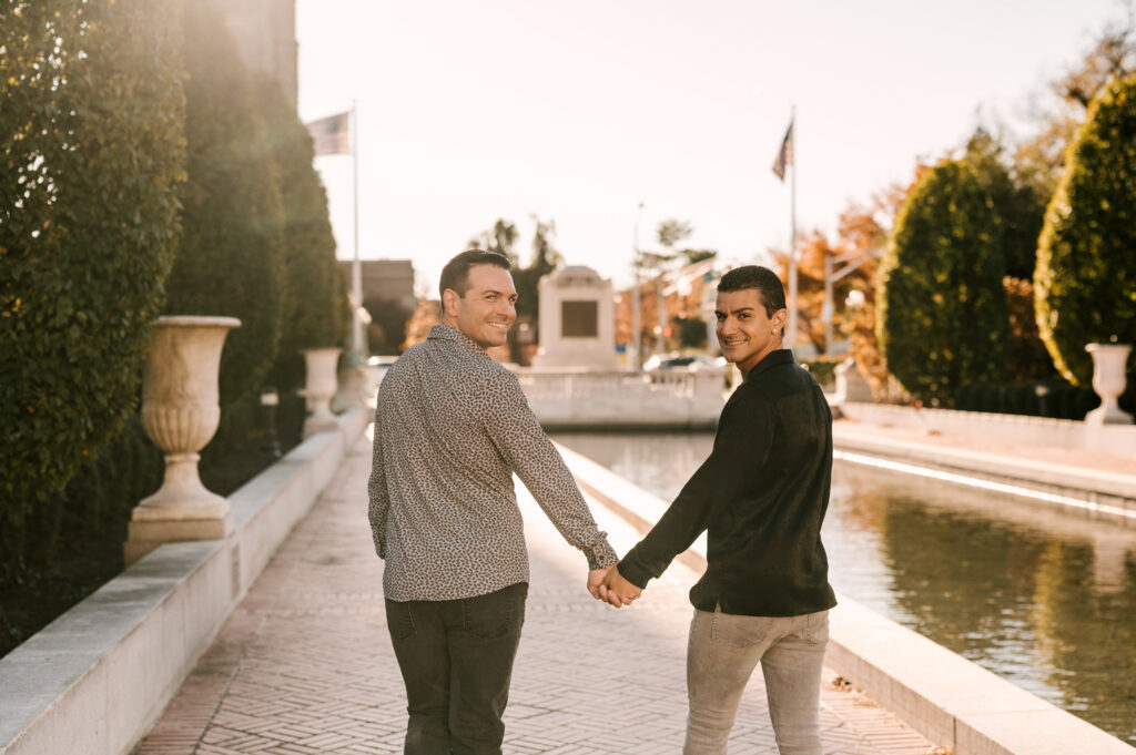 After soaking in the refined atmosphere indoors, we stepped outside to take advantage of Morristown’s picturesque surroundings. Just beyond the restaurant, tree-lined paths and manicured greenery offered a stunning background. As the sun dipped lower, golden light wrapped around them, illuminating their smiles and highlighting the changing leaves of autumn. Hand in hand, they strolled along the reflecting pool, occasionally glancing back with expressions of laughter and love.
